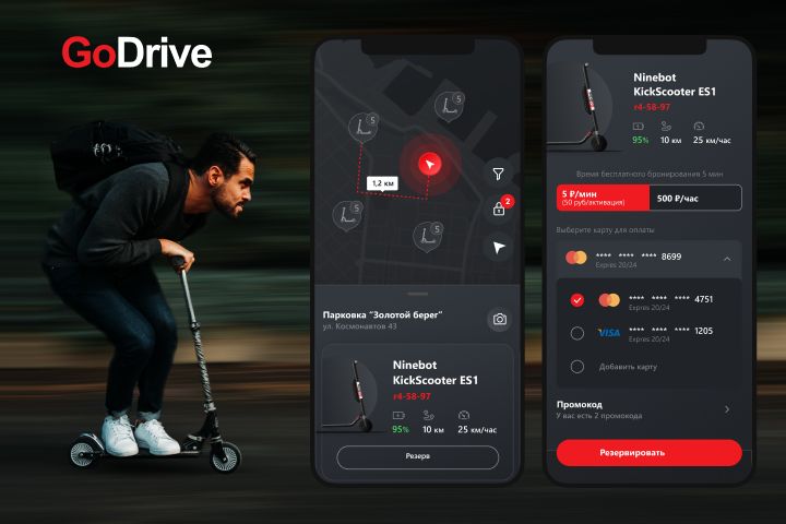 GoDrive - это полнофункциональный продукт для аренды скутеров. Сервис предоставляет широкий спектр возможностей по бронированию, аренде и отслеживанию транспортных средств.