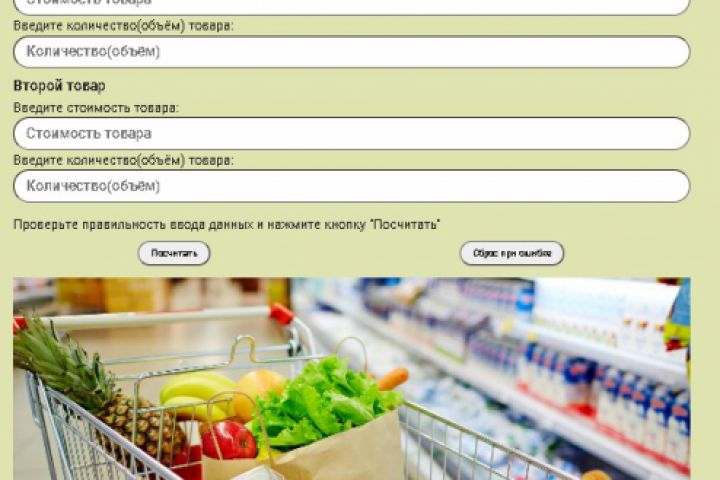 Сайт-приложение, адаптированное в том числе и под мобильные устройства, который позволяет выбрать более выгодный товар из двух. Необходимо просто ввести стоимость и объем (количество) одного товара и второго. После этого программа через модальное окно покажет, что выгоднее купить, и какая выгода с этого получится.