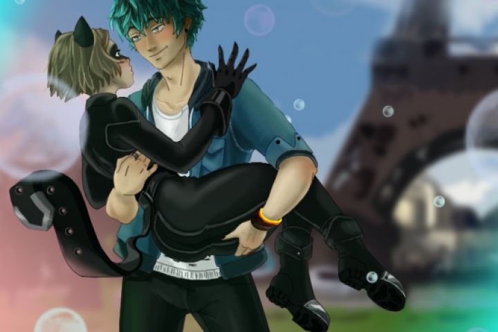 Иллюстрация по мотивам мультсериала "Леди Баг и Супер Кот". Супер кот в женской версии в компании еще одного из героев Луки