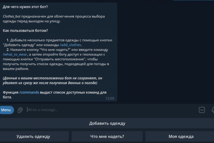 Clothes Bot - Telegram-бот для подбора одежды, который, на основе погодных условий и предпочтений пользователя, подбирает подходящую одежду, учитывая гардероб пользователя.