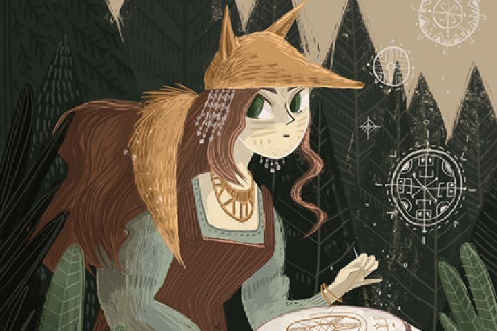 В волшебном лесу живет Лисица. Когда спускаются сумерки, она садится на опушке и вышивает волшебные знаки из лунного света. Сказочная таинственная иллюстрация иллюстрация про необычное в обыденном.