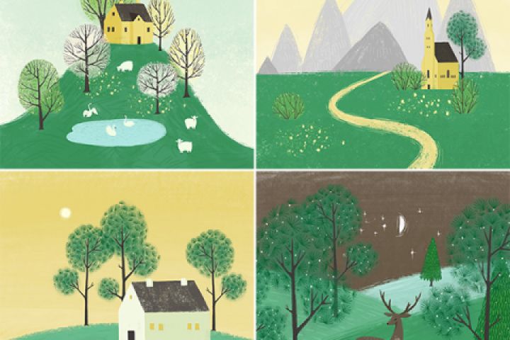 Коллекция весенних пейзажей, отлично подойдет для открыток, дизайна упаковки чая, печенья, для печатной продукции, домашнего декора.
