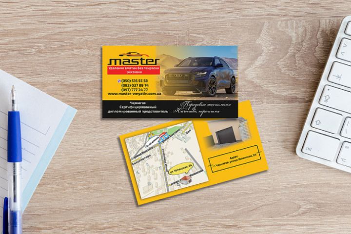 Создание дизайна двухсторонней визитки. Разработка уникальной карты проезда для данной визитки.