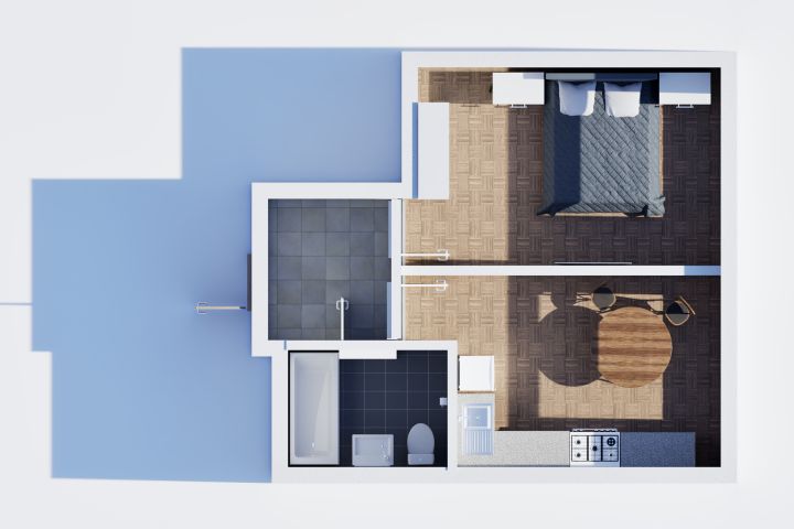 С использованием имеющихся планов помещений и библиотеки готовых ассетов в программе Twinmotion была построена полноценная виртуальная модель квартиры, после чего выполнена визуализация её внутреннего пространства с применением рендеринга.