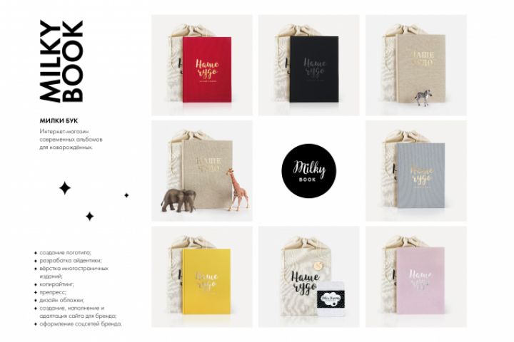 Вёрстка современных альбомов для малышей, бренд MILKY BOOK. Допечатная подготовка, вёрстка, подбор материалов, отрисовка макетов для штанц-форм.