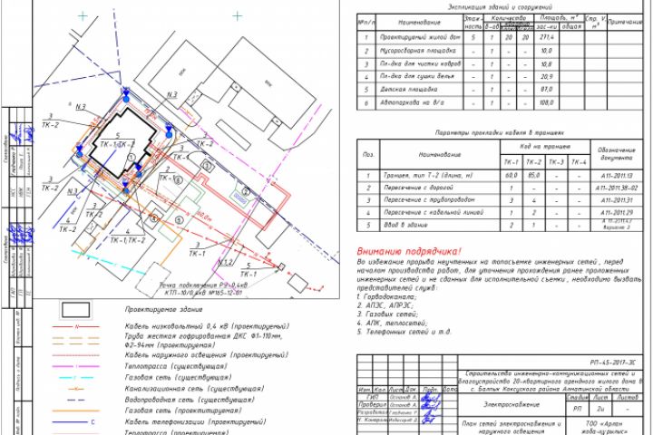 Проект наружного электроснабжения и электроосвещения для 20 квартирного жилого дома выполнен согласно технических условий, задания на проектирование, требований ПУЭ и других нормативных документов. Проект согласован с эксплуатирующей организацией, выдавшей технические условия, прошел государственную экспертизу с положительной оценкой. На данный момент объект, построенный по данным чертежам, построен и введен в эксплуатацию.