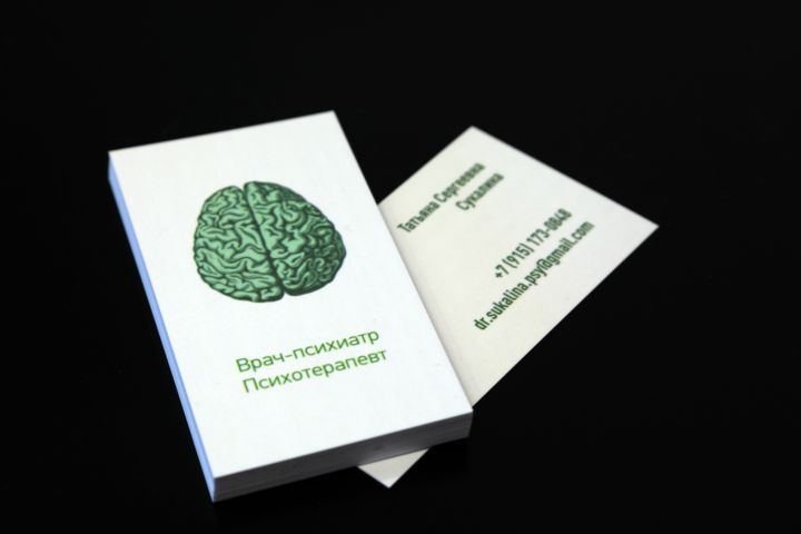Визитка для врача психотерапевта, выполнена в приятных зеленых тонах.