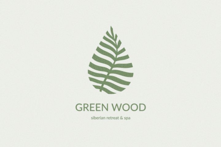 Логотип для спа отеля Greenwood. В основе логотипа образ капли и папоротника.