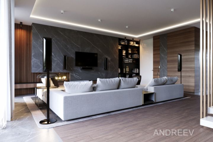 Дизайн проект интерьера в современном стиле в частном доме. Гостиная.
