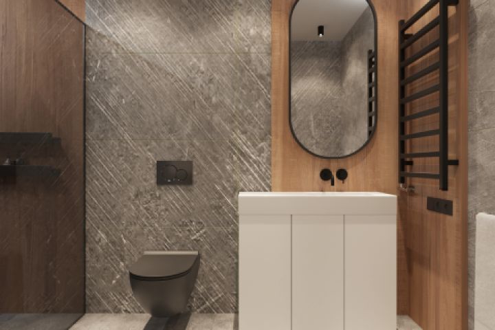 Санузел 8m2, со стеклянной перегородкой и декоративной конструкцией для создания зрительной архитектуры помещения.