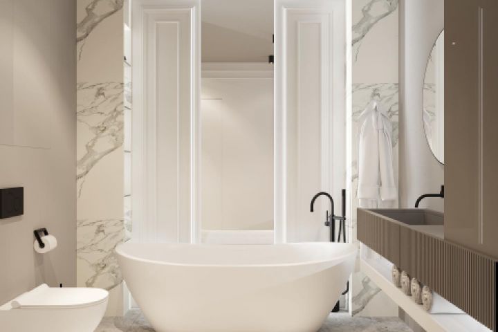 Светлый мастер санузел, с акцентным зеркалом в потолок и LED подсветкой по периметру.