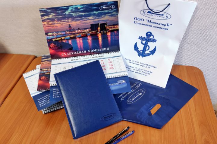 Продукция с использованием логотипа и фирменной символики танкерной судоходной компании: календарь, пакеты, ежедневник, ручки