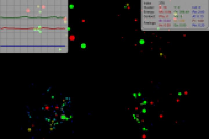На каждое существо можно кликнуть (для этого удобнее увеличить масштаб), и откроется таблица его текущего состояния, кроме того, можно открыть график преобладания геномов в мире. Двойной клик по таблице скроет его.