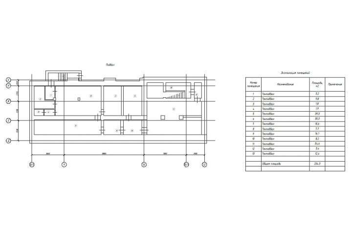 3) Добавить экспликацию помещений, в которой указать номер помещения, наименование, площадь и общая площадь этажа.