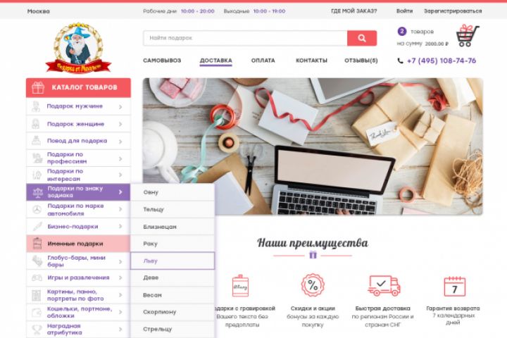 К-во страниц - больше 10. Была поставлена задача разработать яркий, праздничный, уникальный и одновременно "чистый" дизайн для существующего интернет-магазина подарков. Логотип и тексты предоставил заказчик. Дизайн адаптирован также под разрешение экрана 724 и 480 пикселей. В перечень работ входит дизайн страниц Главная, Каталог товаров, Карточка товаров, Каталог категорий, Оплата, Доставка, Самовывоз, Контакты, Подарочные карты, Партнерская программа, Возврат и обмен и другие.