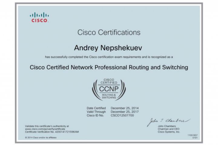 2014 год. Самостоятельно подготовился к Cisco CCNP и прошел сертификацию.