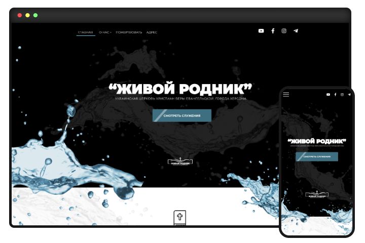 Дизайн сделан в строгом стиле с основными чёрным и белым цветами, а так же исходя из названия «Живой Родник» была разработана концепция с водой которая стала легким фоном на всех страницах и акцентным элементом на главной первой странице сайта.