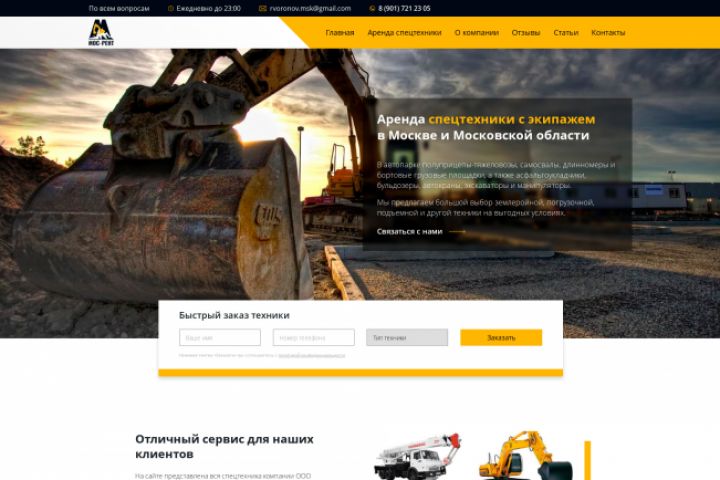 Аренда спецтехники с экипажем в Москве и Московской области. Сайт работает на cms ModX. На странице каталога реализован удобный ajax фильтр для поиска необходимой техники.