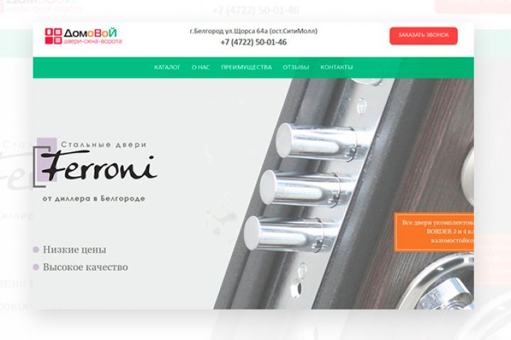 Сайт фирмы "Домовой" по продаже металлических дверей. При разработке использованы технологии: HTML5, CSS3, Bootstrap3, JQuery, Ajax.