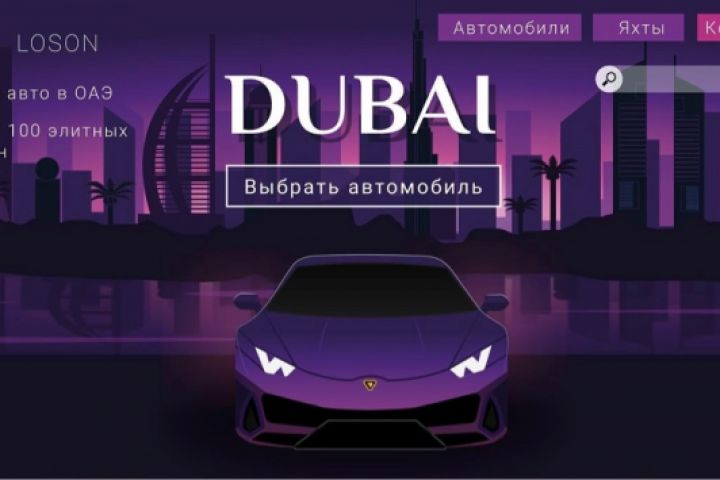 Требовалось разработать посадочную страницу для сайта по аренде спортивных машин в Дубае. На заднем фоне изображен силует Дубая, на переднем автомобиль марки - Lamborghini