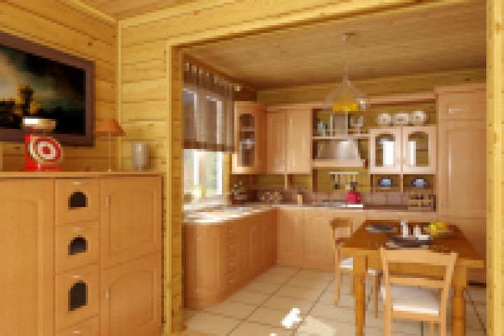 Кухня и столовая в деревянном коттедже