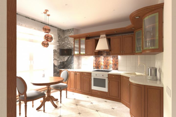 И, наконец, после навешивания верхних шкафов монтируется скрытый шкаф для кухонной техники (кухонного комбайна, хлебопечки и пр.) на уровне фартука справа от вытяжки. Фасады подбираются под светлую плитку фартука, а глубина имитирует перепад стены слева от вытяжки, что и делает его скрытым, незаметным. Таким образом под вытяжкой образуется ниша, выделенная медной плиткой.