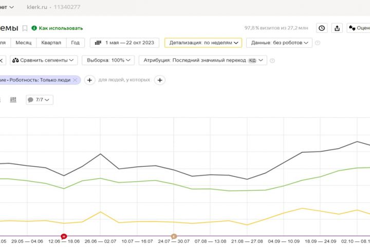 Я работал с декабря 2022 года по ноябрь 2023 года. На графике с мая по октябрь. Как раз виден излом в конце августа. Это результаты предварительной работы с сайтом. Здесь трафик, как Вы видите исчисляется большими показателями.