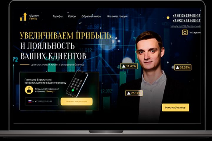 Сайт для специалиста по увеличению прибыли. Выполнен в темной цветовой схеме с использованием акцентных элементов