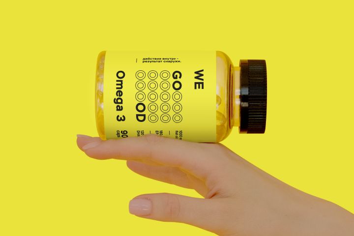 На этикетке логотип размещаем так, чтоб «GO..OD» был на равном расстоянии от «WE» и наименования продукта, таким образом добавляем положительное впечатление содержимого, т.е. данная композиция читается и как «WE GO..OD», и как «GO..OD OMEGA 3».