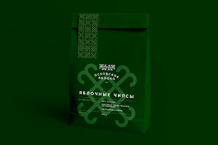 В разработке дизайна упаковки для яблочных чипсов были задействованы символы псковского славянского орнамента на тему плодородия, земледелия и урожая (с вышиванок 19-ого века).