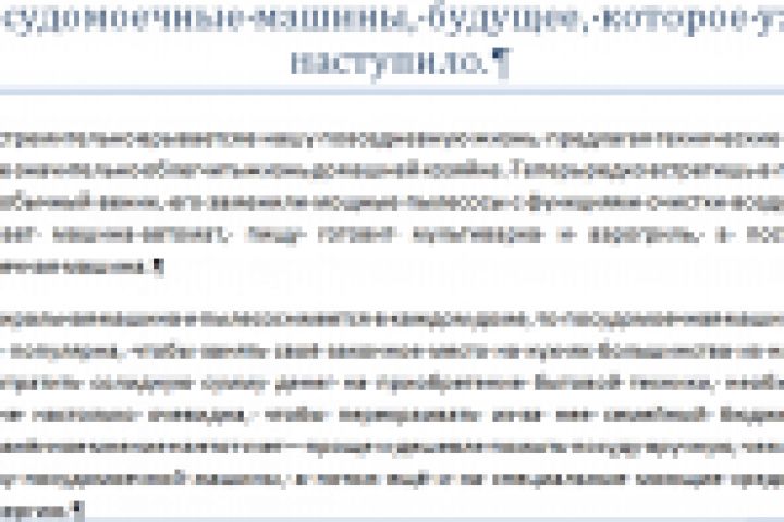 Статья о преимуществах и недостатках посудомоечных машин. Текст построен таким образом, чтобы максимально раскрыть для читателя все достоинства этой бытовой техники. При необходимости в текст могут быть встроены ключи. Объём текста 10549 знаков без пробелов.