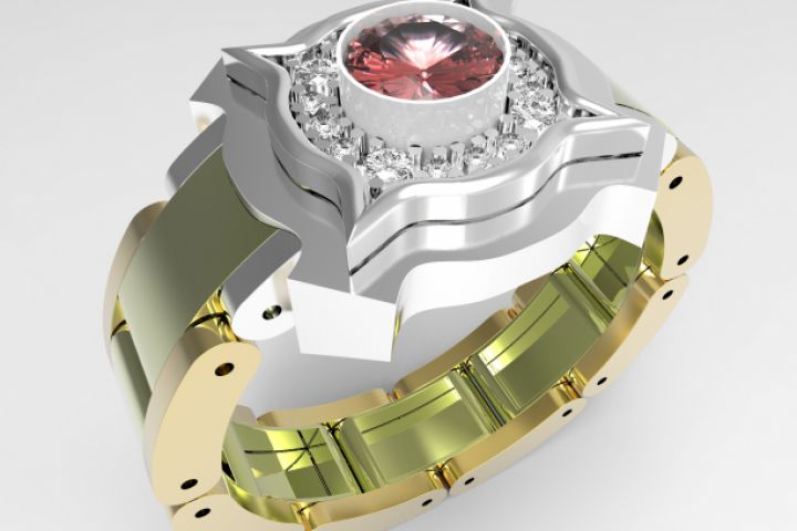 Золотое кольцо с малыми бриллиантами и большим рубином в центре.