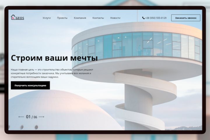 Реализация "воздушной страницы" под-ключ от дизайна до интеграции административной панели для строительной корпорации GEOS