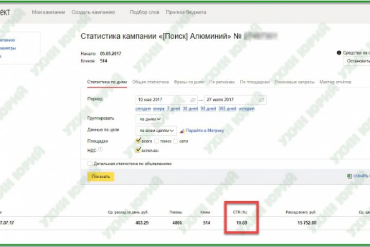 Поисковая рекламная кампания Яндекс Директ для производителя алюминиевых конструкций(окна, двери, витражи) г. Москва aluminium.okkontinent.ru - CTR более 10% - Цена клика 30 руб. (очень хорошая цена для ниши окон по Москве)
