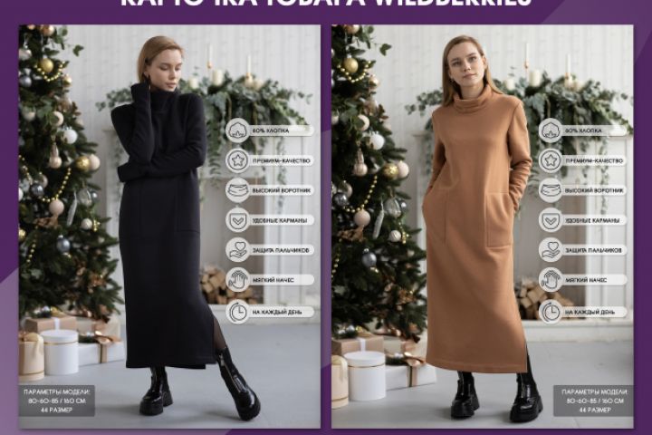Инфографика для карточки товара WB с указанием характеристик и конкурентных преимуществ платьев.