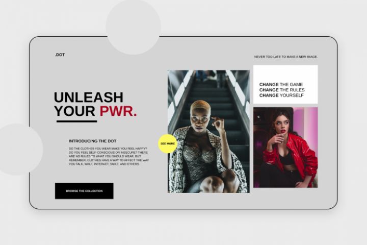 Первый экран для вымышленного магазина женской одежды. Хотелось сделать дизайн, который немного выходит за рамки стандартов. Именно поэтому здесь такое расположение элементов, два призыва к действию. Нам ведь всем иногда хочется "выделиться", так почему бы не сделать это через дизайн :)
