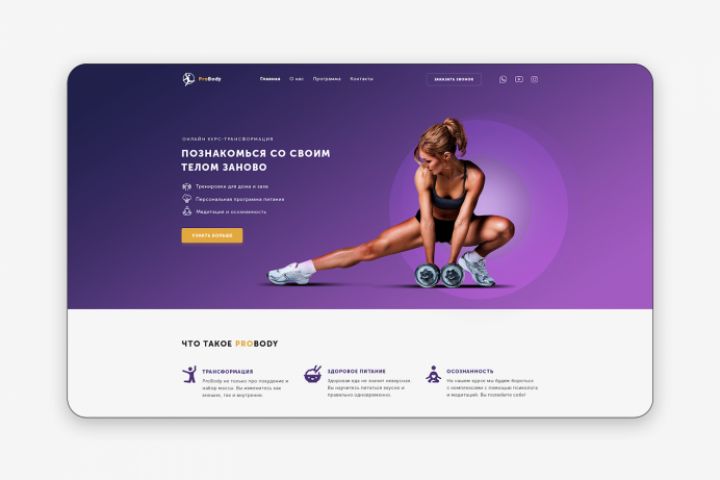 Дизайн Landing Page для онлайн фитнес-курса. Целью было сделать небольшой лендинг, в котором показать преимущества курса, программы, результаты и цены. А так же указать на то, что и имеется мобильное приложение.
