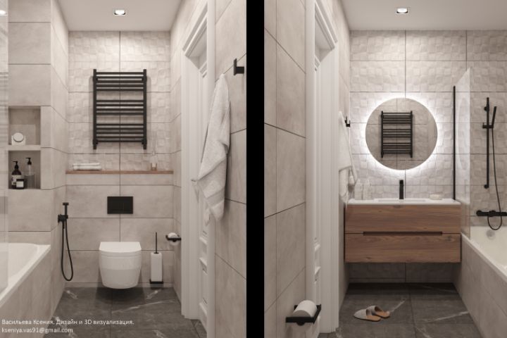Мастер-ванная нашего проекта в Выхино приобрела сдержанные благородные тона. Сделать помещение более интересным помогли яркие акценты: декоративная плитка, смесители черного цвета. Мебель из натурального дерева добавляет теплоты в интерьер.