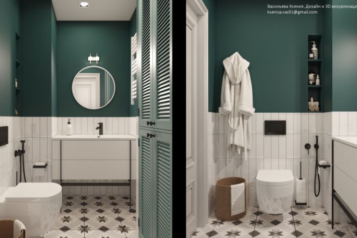 В гостевом санузле нашего проекта я решила скомбинировать покраску темно-зеленого цвета и белую глянцевую плитку «кабанчик».