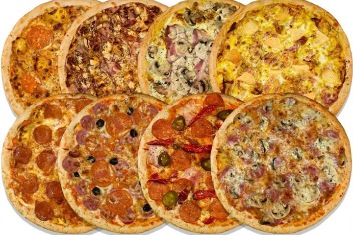 Обработка фото пиццы, вырезка на белый фон, улучшение качества вида продуктов, составление комбо из пицц.