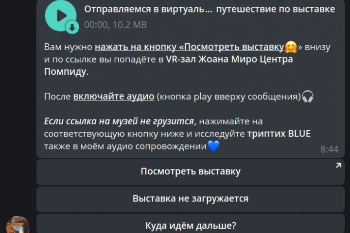 В данном боте происходит квест, который рассказывает про выставки известных художников. Проходя этот квест вы можете погрузиться в него по скольку он довольно интересен.