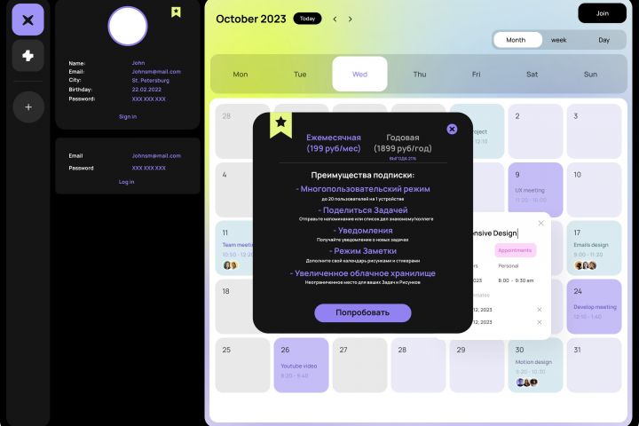 календарь с обширным функционалом сложной логикой подпиской и тд