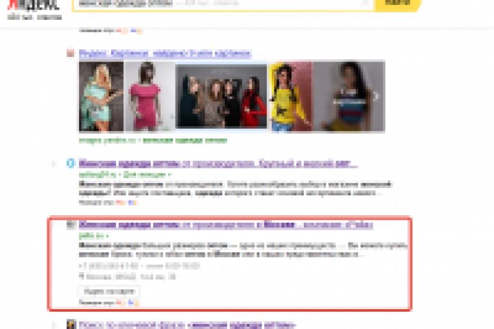 Продвижение сайта по России. Конкурентный высокочастотный ключ "женская одежда оптом". Wordstat ключа по России - 33628, Wordstat по Москве без учёта Подмосковья - 5617. На скриншоте седьмая позиция в ТОПе по Москве.