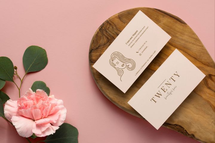 как основной для визиток. Для текста был взят коричневый цвет, который сочетается с розовым по принципу
