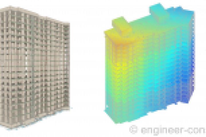 Общий вид и расчетная схема 17-ти этажного 3-х секционного жилого дома. Полный каркас из железобетона на естественном основании. Стены из штучных материалов. Выполнен расчет, стадия П раздел КР, получено положительное заключение экспертизы. Московская область.