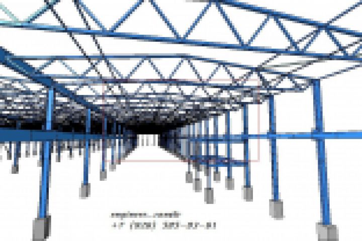 Расчетная схема производственного корпуса машиностроительного завода. Мостовые краны грузоподъемностью 5 тонн, режим работы 6к. Пролет ферм 24 м, шаг средних колонн 12 м, фахверка 6 м. Покрытие типа молодечно беспрогонное. Подстропильные балки - желание заказчика. Расчетная схема выполнена в Лире. Получено положительное заключение гос экспертизы. Калужская область, район Правобережье.