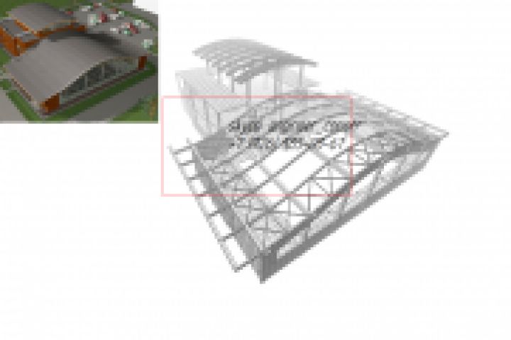 Расчетная схема ФОК с бассейном. Каркас здания монолитный железобетонный. Покрытие чашы бассейна выполнено из профнастила по деревянным балкам и прогонам из клееной древесины. Покрытие спортивного зала из профнастила по трехшарнирным аркам из клееной древесины. Проспект Строителей г. Владимир