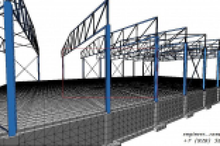 Расчетная схема небольшого холодильного склада. Размер в плане 30х54. Монолитный ж/б фундамент, подпорные стены с контрфорсами. Колонны из прокатных профилей, фермы из парных уголков. Пролет ферм 30 м, высота здания до низа ферм 7,2 м. Московская область, Истринский район, д. Никулино.