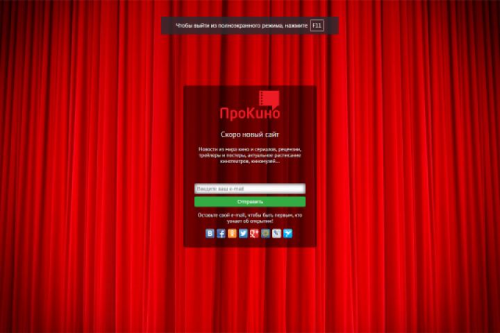 Заглушка для сайта prokino.ru Адаптивная верстка, валидация полей, запись информации в бд, проверка на повторяемость емейл-адреса и оставление заявки с одного компьютера, грамотная организация 404 ошибки, постинг информации в соц. сети