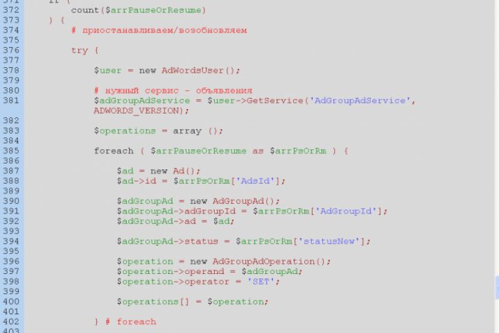 Для заданного Adwords-аккаунта периодически получаем объявления, соответствующие заранее заданному критерию, и записываем их в базу данных. Сторонний инструмент (не входил в задание) корректирует в базе признак приостановки или возобновления. Требующие изменения объявления периодически соответственно возобновляем или приостанавливаем.